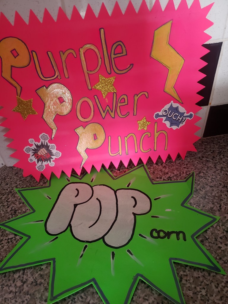 Other decorations included signage. Here are a couple that we used. I found bulletin board signs at Hobby Lobby and used paint markers to write. The superhero exclamation used throughout the decorating and as prizes are from Temu.