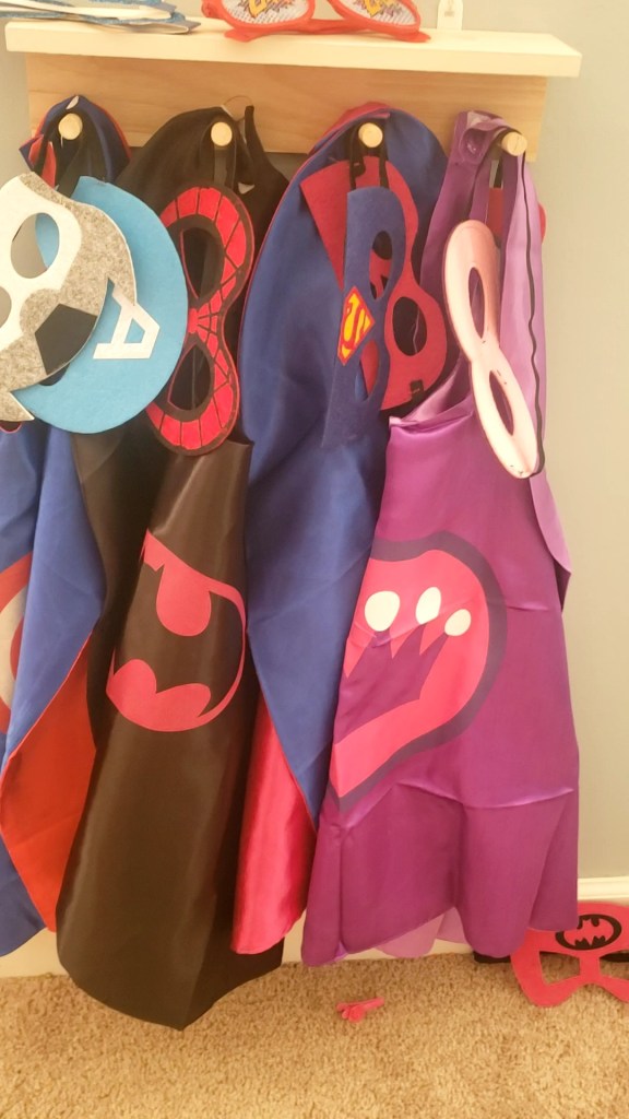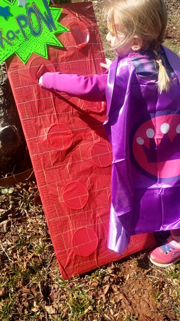 Some comic book superheroes made their way into the party. Grandma bought a pack of superhero capes with masks for all the kids to wear at the party. Get yours here. They had a fun time playing dress up. Then, after choosing which superhero they wanted to be, it was time to put their hero skills to the test!