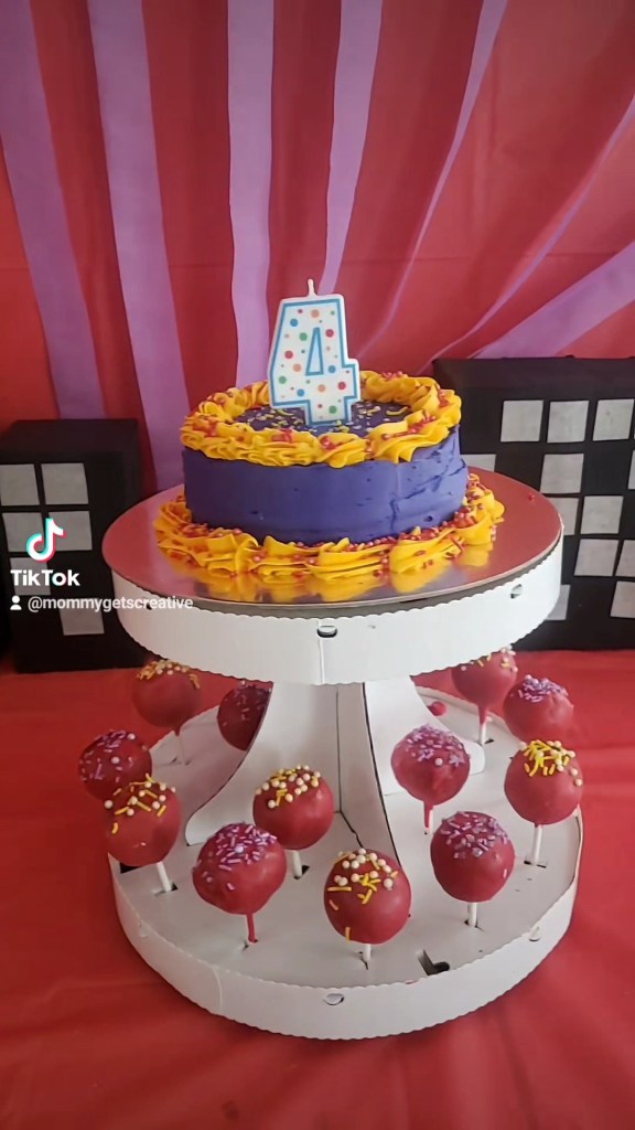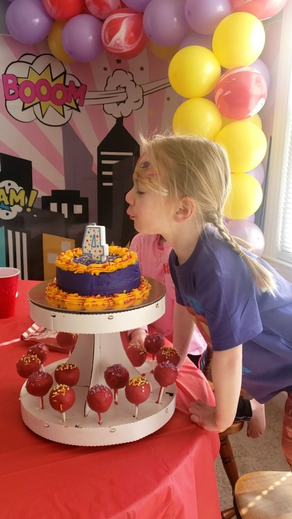 The cake design is by request of the 4-year-old. For kids’ parties, especially the little ones, I highly recommend cake pops. They are smaller than cupcakes so less waste (and less of a sugar high!). The top cake was served to the adults. This gave her something to put a candle in to blow out. She requested chocolate cake for the cake pops, and she selected the colors. I made a yellow cake with blueberry compote in the middle to add some options. I like to make things from scratch since I enjoy baking. If that’s not your thing, support a local baker! The cake stand is from Hobby Lobby.