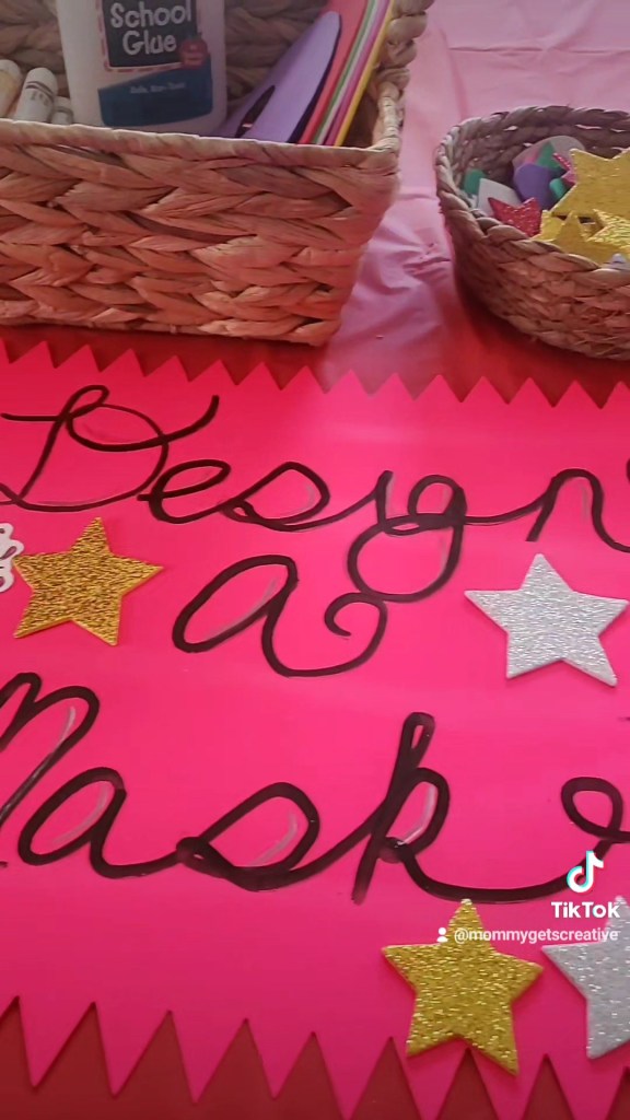 Each guest got to make their own mask. I used foam sheets I found at Walmart to precut masks and provided foam shape stickers we already had and markers for everyone to decorate with. We cut slits in the sides and used balloon string to tie around to their size.