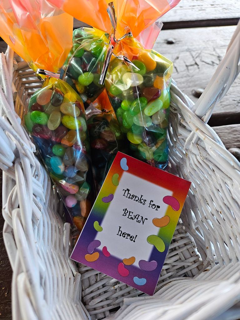 Everyone went home with a rainbow bag of jellybeans (normal ones) and a little thank you note. These are the favor bags I used. Everyone had a great time and kids and parents alike were exhausted after!