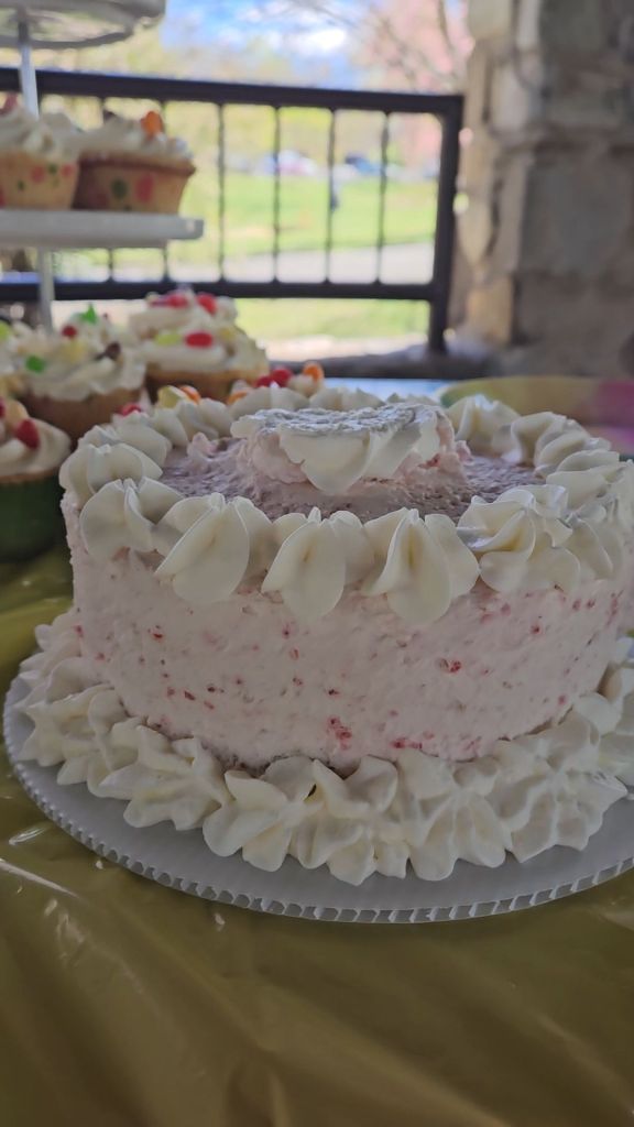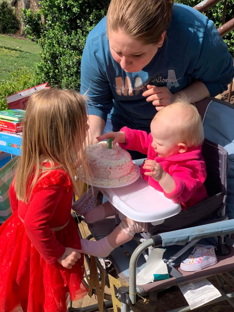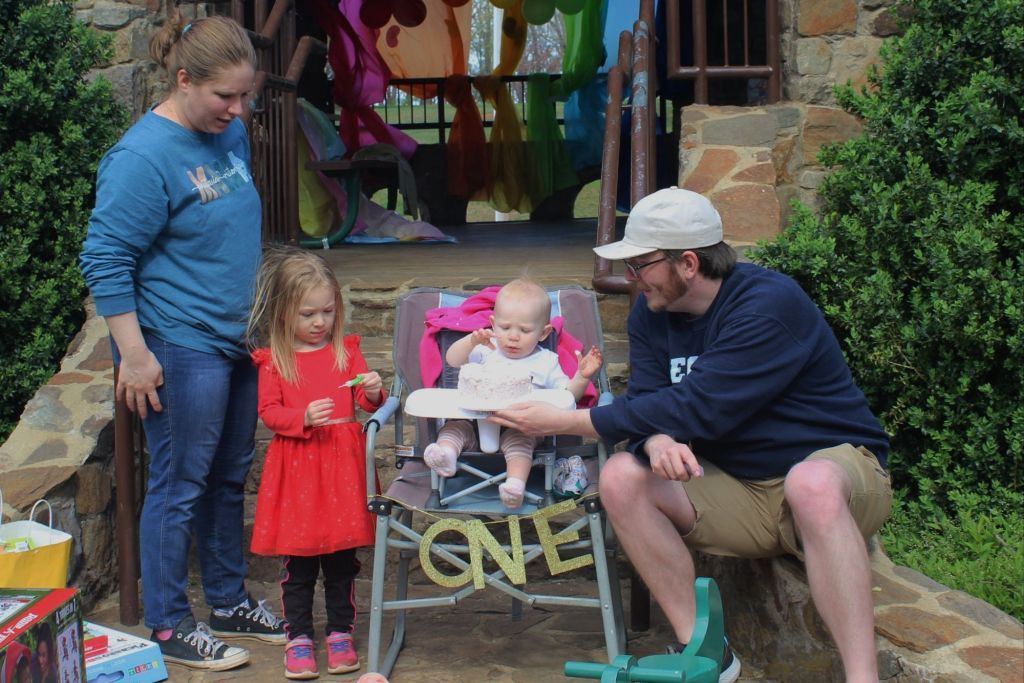 The birthday girl had her own smash cake. No first birthday party is complete without the guest of honor smashing through a cake. Again, I could have easily picked this up at a bakery, but that’s not my style. I used a sugar free recipe to make this strawberry banana cake. The “icing” is whipped cream. I made this by whipping up some heavy whipping cream with the mixer until it was stiff and made it pink by adding in some freeze-dried strawberries that had been crushed with a rolling pin into a powder. I skipped the sugar for the whipped cream. If you want to make it sweet, I just add tablespoons of sugar at a time as I’m mixing until it is the sweetness I want. This cake turns out much like a muffin as far as taste and texture. There was quite a bit leftover, and she didn’t actually destroy the cake, so we took the rest home. It’s great for breakfast with a cup of coffee!