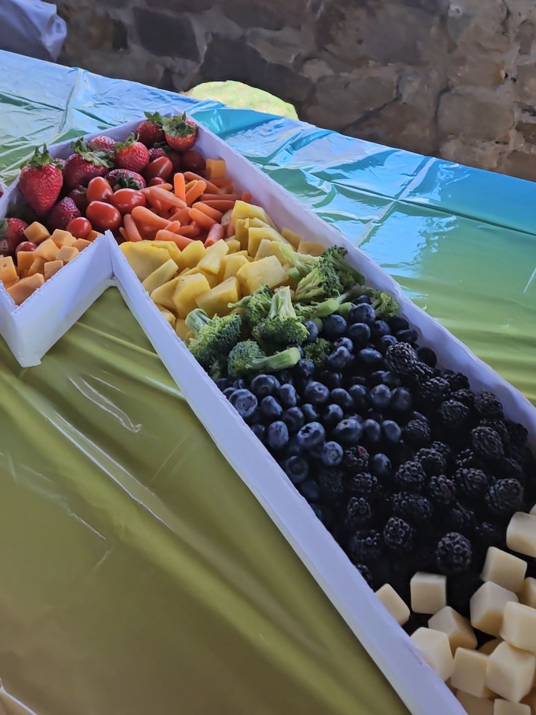 I love a good charcuterie board (although technically, when it’s just fruits and vegetables, it’s called crudité – pronounced crew-di-tay). It took me about 10 minutes to make this 1. I just cut out the 1 shape from a foam poster board and used the rest of it to create the sides about 2 inches tall. Measure if you want, but I just eyeballed it all and used open scissors to score all the cuts (a box cutter would have been better, but I don’t have one). I used masking tape to hold it together. Then I lined it with wax paper. I cut the pineapple and broccoli ahead of time so all I had to do when we got to the shelter was dump everything in rainbow order.