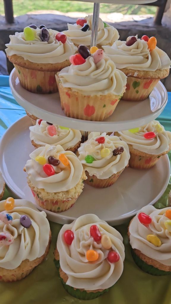 Did you know that box cake mixes have less in them than they used to? I’ve had to get a second box just to make a whole cake or have enough cupcakes. I tried making cake from scratch and turns out it is so much easier than Big Box Cake will make you believe. Of course, I could have picked up a dozen cupcakes from the bakery, but I enjoy baking so I do it myself. I made a simple white cupcake with vanilla buttercream and topped them with jellybeans, which 4-year-old big sister happily helped with!
