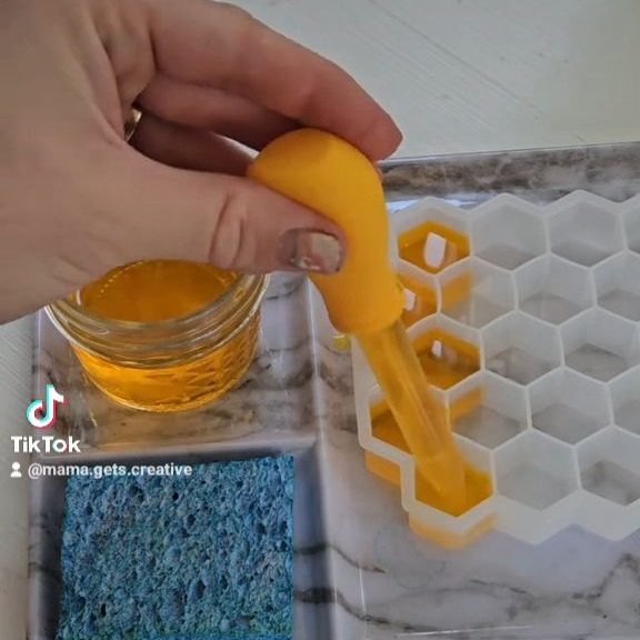 For a fine motor activity, I found a silicone mold like this one that looked like a beehive. I used colored water to look like honey. My preschooler used a dropper to fill in each hole and then return it back to the jar. She had fun pretending she was a bee filling in the cells.