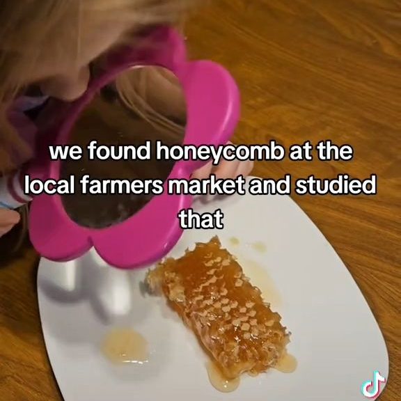 I found some whole honey comb at a farmers market. We got out the magnifying glass to get a close up look at the comb the bees worked so hard to make. My preschooler was amazed at this, and especially the loved taste testing!